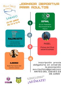 Aquí tenéis la información de las actividades deportivas para adultos que, previa inscripción  al correo: avv.riochico@gmail.com  , podréis disfrutar de forma gratuita el 25 de junio.
